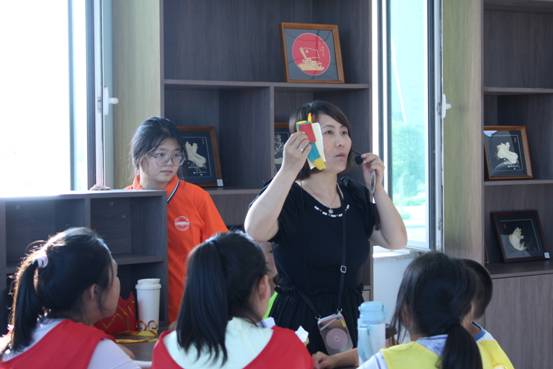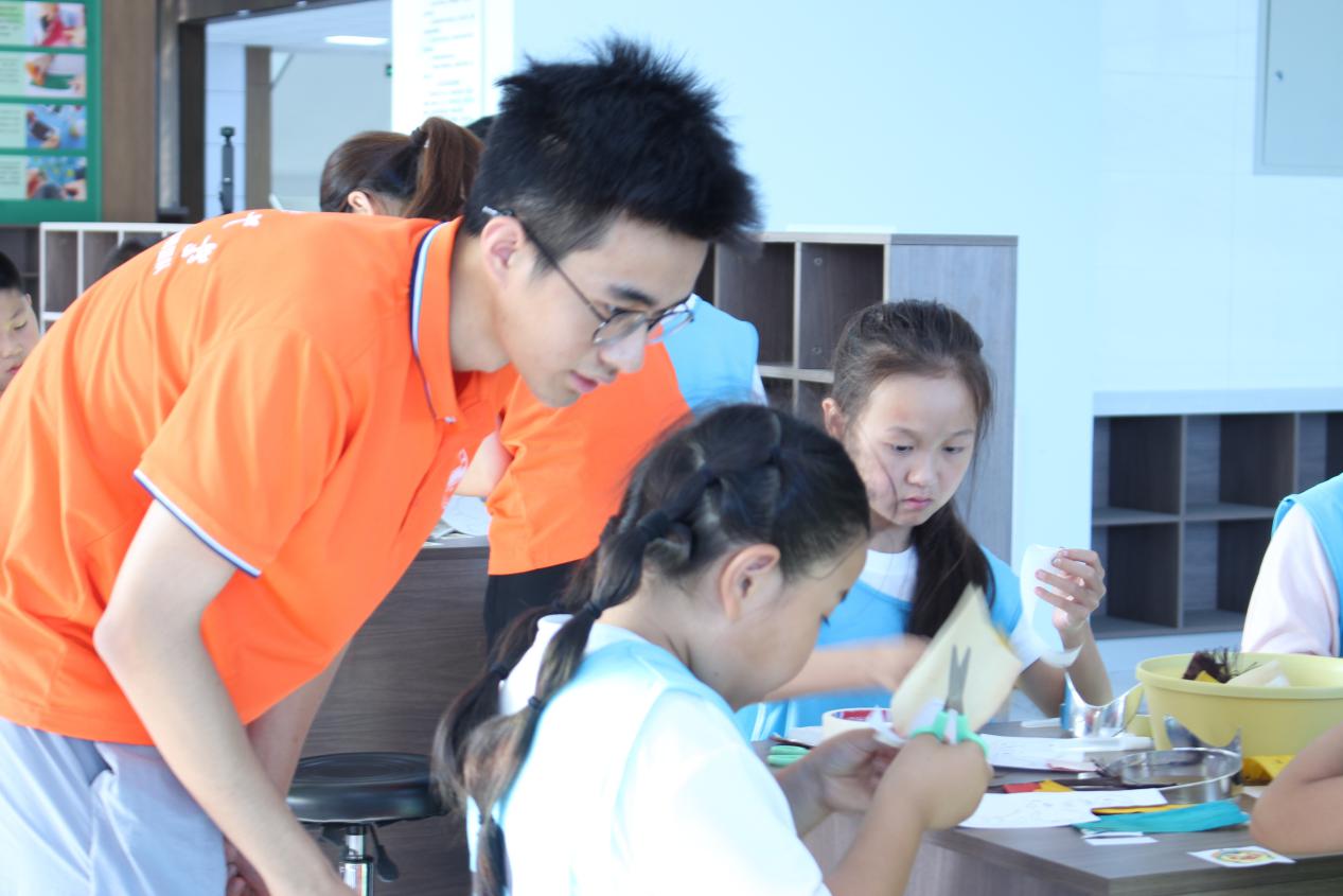 图为实践团成员现场指导小朋友制作玉米皮书签 尹择宁供图