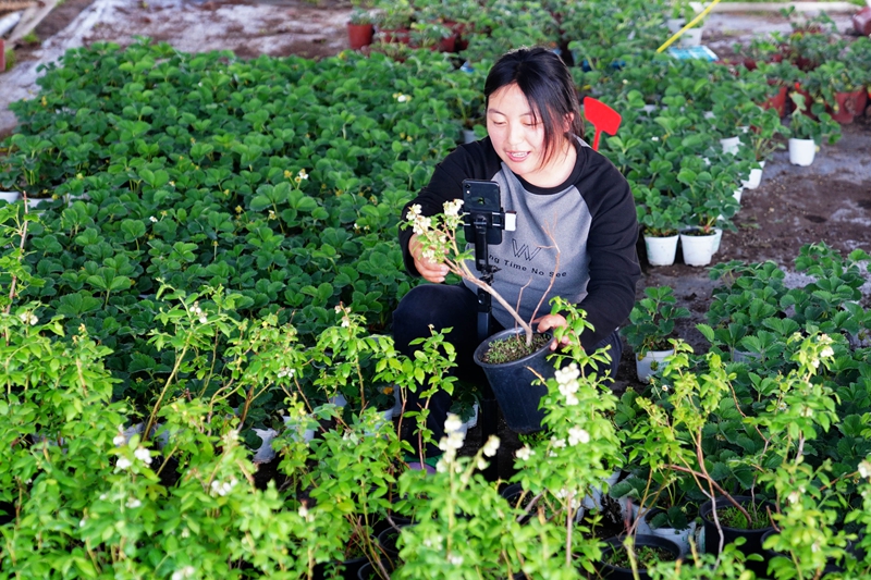 2024年4月27日,在山东省惠民县姜楼镇立冉果蔬种植合作社,工作人员在直播卖蓝莓苗。