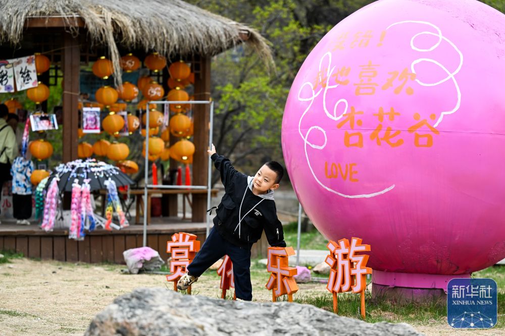 ↑ 5月4日,小朋友在位于回民区东乌素图村的乌素图杏花谷景区拍照。
