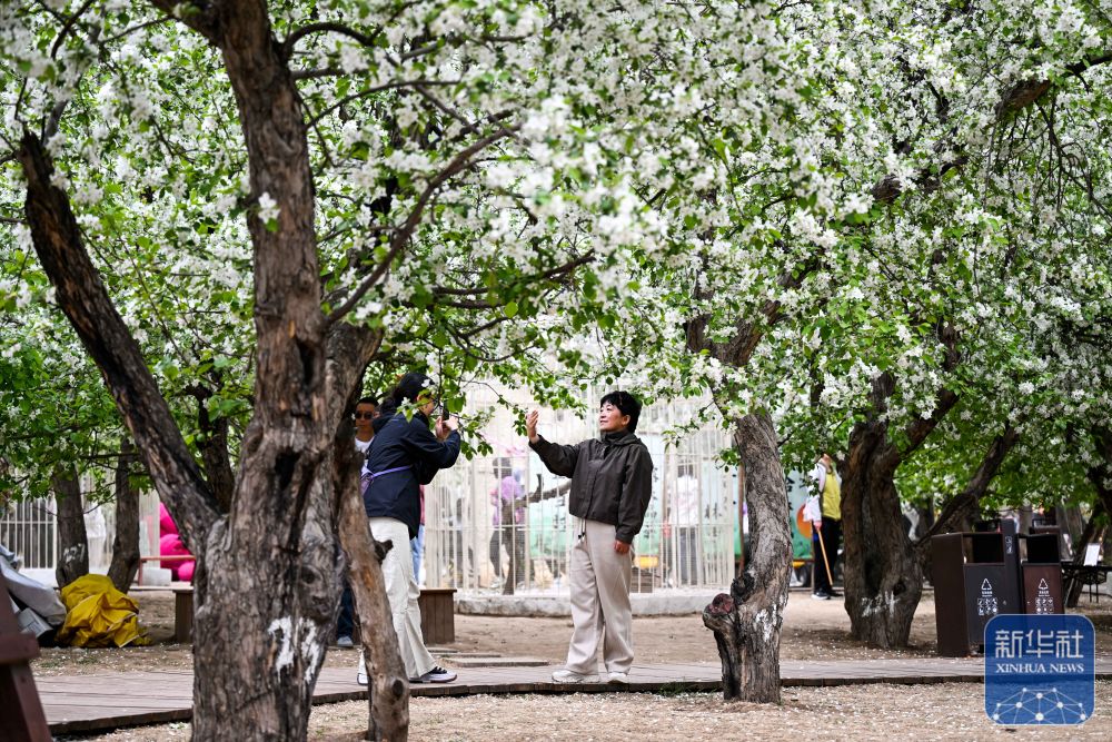 ↑ 5月4日,游客在位于回民区东乌素图村的乌素图杏花谷景区拍照。