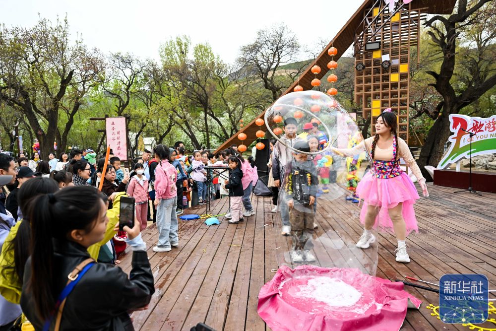 ↑ 5月4日,小朋友在位于回民区东乌素图村的乌素图杏花谷景区体验游乐项目。