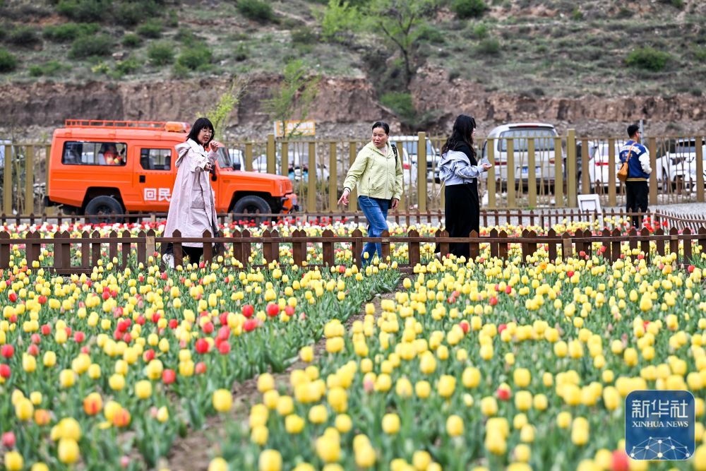 ↑ 5月4日,游客在位于回民区东乌素图村的乌素图杏花谷景区游玩。