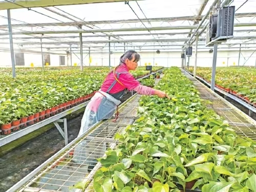 在花卉基地内,王丰告村村民刘宪花正进行技术工作。基地经理表示,项目不仅让村集体受益,还带动7名周边群众实现家门口就业,年人均收入达3.6万元。