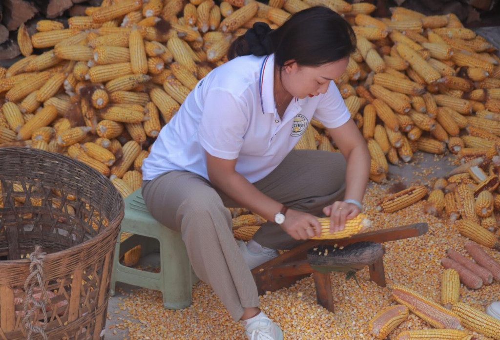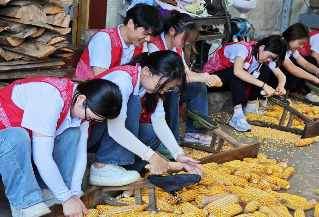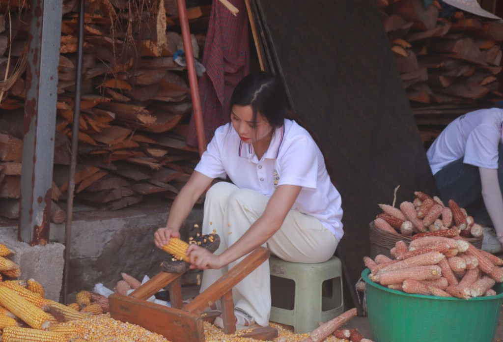 图为指导老师梁姣做玉米脱粒工作