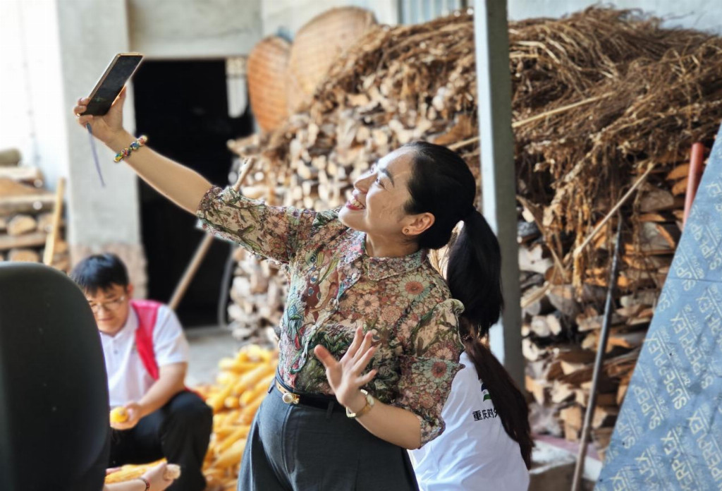 图为代小月书记直播促进团成员玉米脱粒