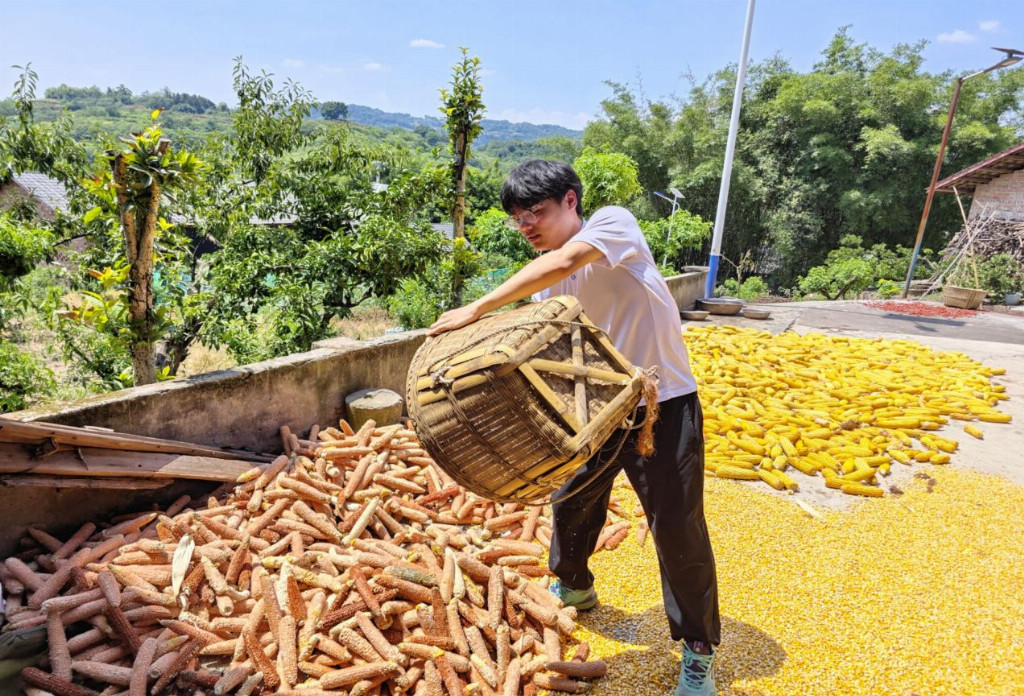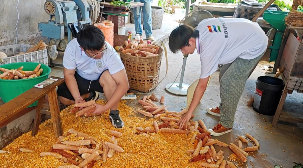 镜头转向热火朝天的劳动现场:金灿灿的玉米堆旁,青年学子们动作娴熟,拇指轻推间,饱满的玉米粒如珍珠般纷纷滚落。伴随着清脆的“嚓嚓”声,金黄的玉米粒很快堆积成小山,展现出当代青年务实高效的精神风貌。这场别具一格的农事直播,巧妙融合传统农耕与现代传播方式,既生动展示了保坪村的优质农产品,又彰显了青年力量为乡村振兴注入的新活力。
