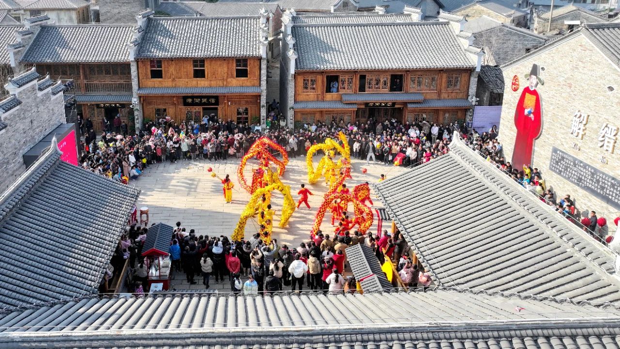 民俗表演队在上下老街舞龙舞狮吸引了游客驻足