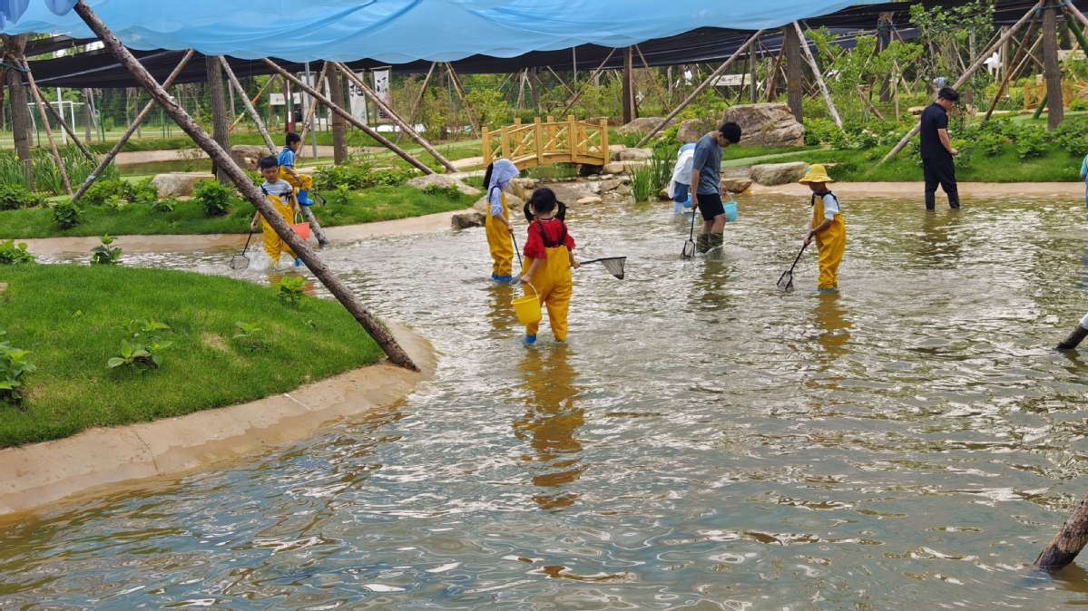 在山东省日照市东港区归耘农场,孩子们身着涉水皮裤,手拿水桶渔网,在潺潺水声中肆意玩耍,感受捕捞的收获。日照市东港区归耘农场以“乡村亲子微度假”和农业科普研学为核心,让游客可以体验趣味摸鱼、趣味捉鸡、农事体验,感受田园生活的质朴与快乐;还能在萌趣龙猫特色土窑中烤制地瓜等,尽享独特的田园风味。此外,研学农田、运动球场、超大充气城堡等设施,为不同年龄段的游客提供了多样化的游玩选择。农场湖畔数千平米的活动草坪,更是开展露营、野餐、烧烤等休闲活动的理想之地。自营业以来,归耘农场累计接待游客超5.2万人次,为本地乡村文化旅游注入新活力。