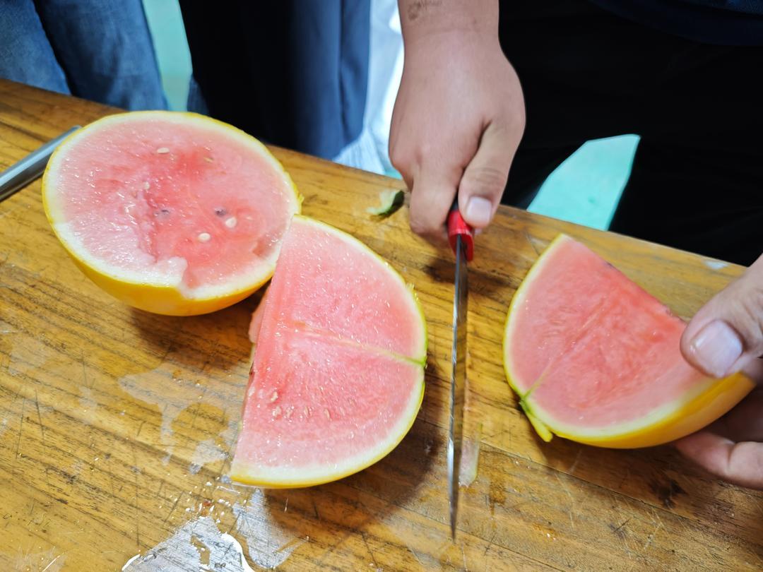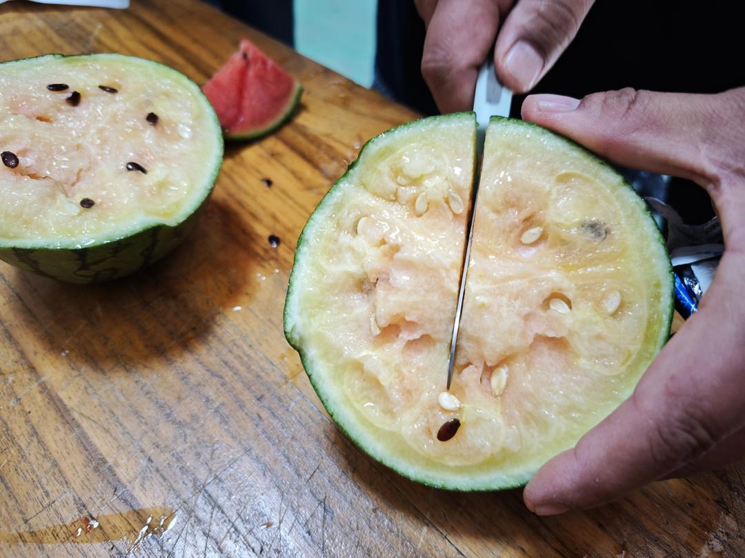 现场,一位村民用刀具在西瓜表面轻轻一划,徒手就将西瓜掰开,用手剥掉外皮,露出红色的瓜瓤,汁液饱满。“西瓜很甜,最近测的甜度在13.5—13.7。”