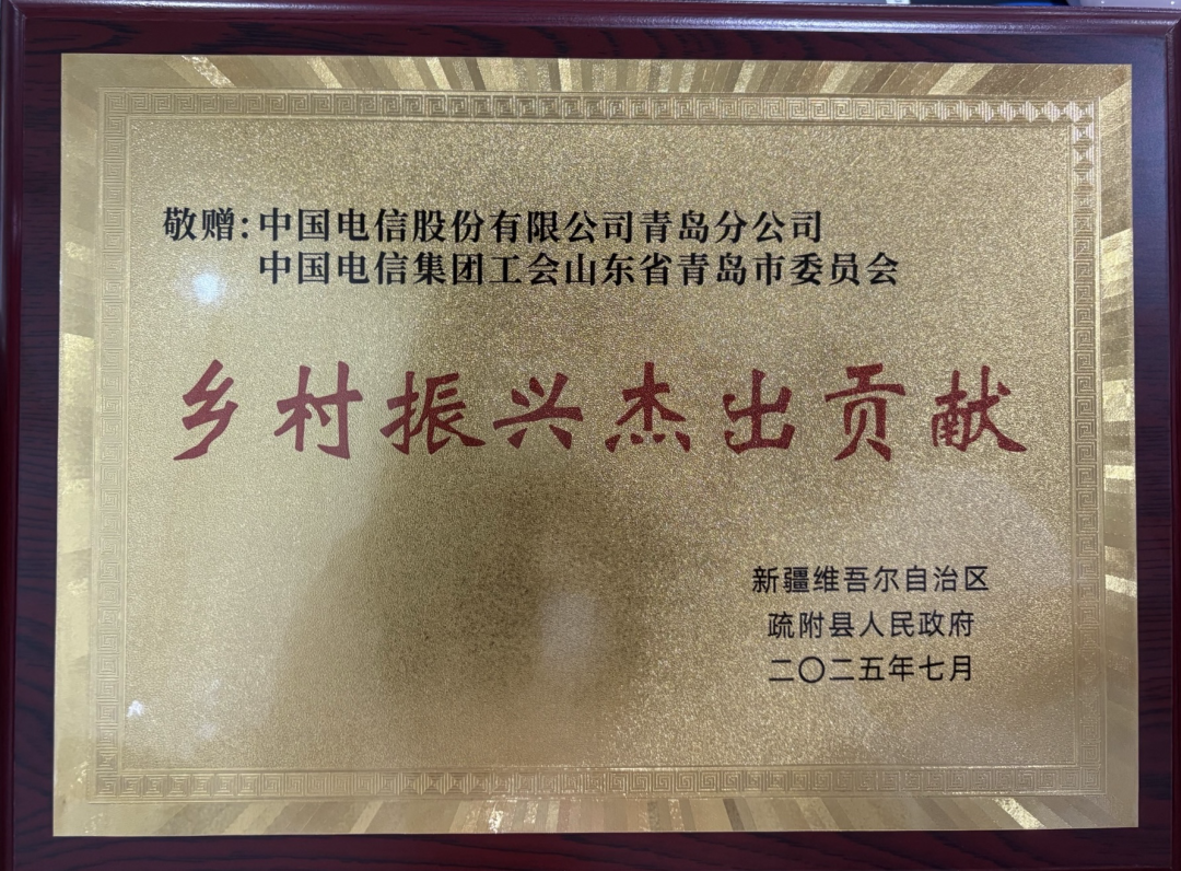 近日,中国电信青岛分公司荣获新疆疏附县人民政府颁发的“乡村振兴杰出贡献”奖牌。这一荣誉的背后,凝聚着其在消费帮扶领域为疏附县乡村振兴注入的强劲动能,既是对其多年来深耕疏附县帮扶工作的高度肯定,更是对其以消费帮扶激活边疆产业活力的有力见证。