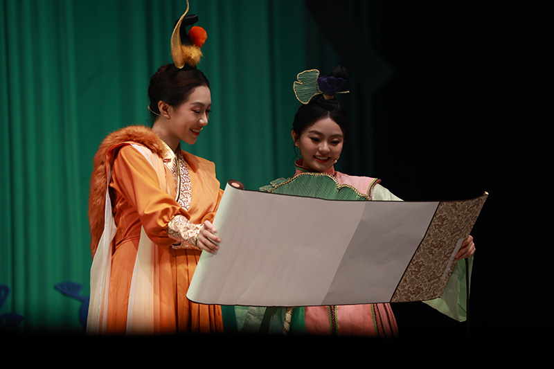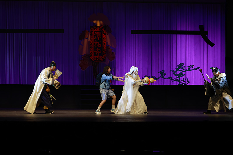 舞台上,传统元素与现代舞美交相辉映。演员们精湛的表演将每个角色都塑造得活灵活现:龙王威严中透着慈爱,小福仙们各具特色,现代少年柘生的求知精神更是引发在场小朋友的共鸣。当小石鱼献上“希望”、银杏叶展现“勇气”、小老虎彰显“慈悲”、小灵狐诠释“格局”时,观众席不时爆发出阵阵掌声和欢笑声。