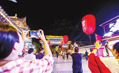 在古镇的买卖街“赶大营”主题市集,3d墙绘生动还原杨柳青人挑担西出的历史场景,天幕投影演绎“百艺进疆”的奋斗故事,让游客沉浸式感受历史文化;御河道国庆主题市集汇聚非遗手作、特色美食等,傍晚时分,无人机、孔明灯点亮夜空,年画娃娃、货郎等造型接连呈现,成为游客争相拍照的亮点。“古镇绘盛世,画游杨柳青”主题嘉年华期间,年画长卷邀游客共创;中秋掌灯仪式上古装“仕女”提灯巡游,国风乐器演奏、民俗绝技表演接连上演,全方位展现西青文旅魅力。